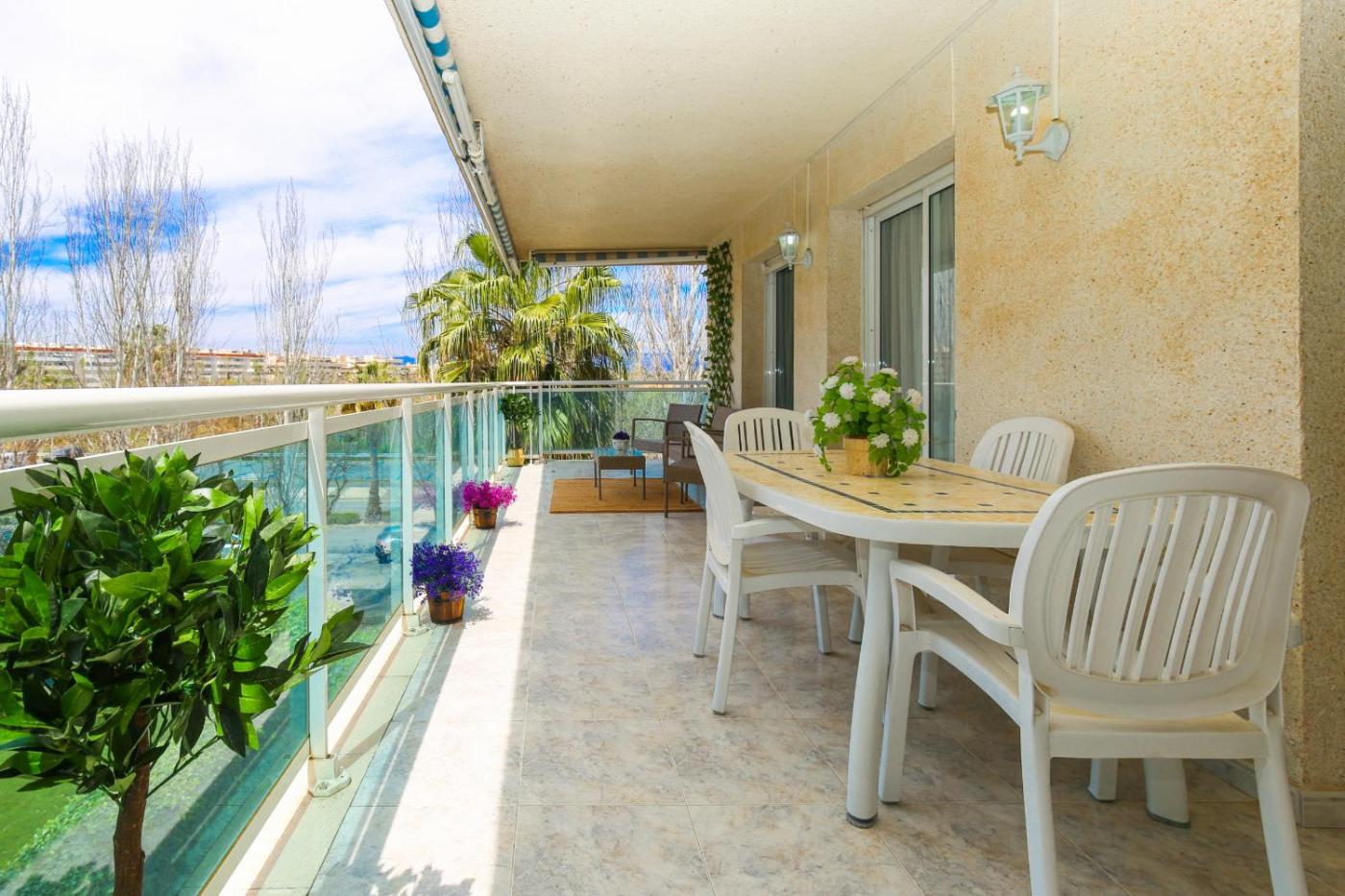 El apartamento cuenta con 3 dormitorios, 2 baños, ropa de cama, toallas, TV, cocina totalmente equipada y terraza con vistas al jardÃn.